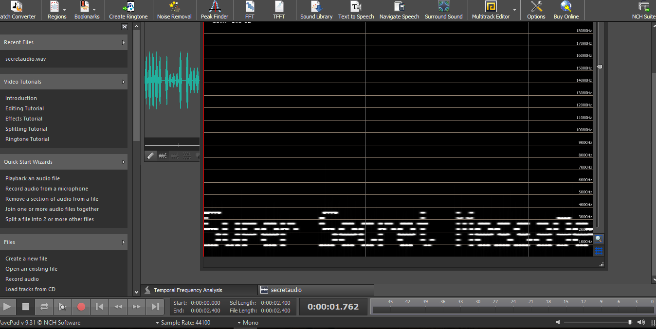 This task is easy. Just download any sound or wave analyzer tool such as aducity. For this task, I going to use wavepad. Simply open the downloaded wave file and open it up in TFFT (Tool > TFFT). A message will be revealed.